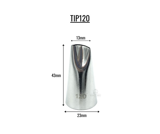 The Tip 120 is a wide petal nozzle that makes large, realistic flower petals, roses, and layered floral textures. Its wider mouth provides smooth coverage for cake edges and elegant blooms. Perfect for professional floral cake designs.