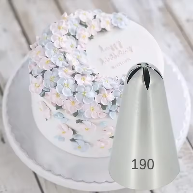 The 190 drop flower nozzle creates perfect embossed flowers with a single squeeze. Great for decorating cupcakes, borders, and cake tops. Ideal for easy and fast floral designs with buttercream.