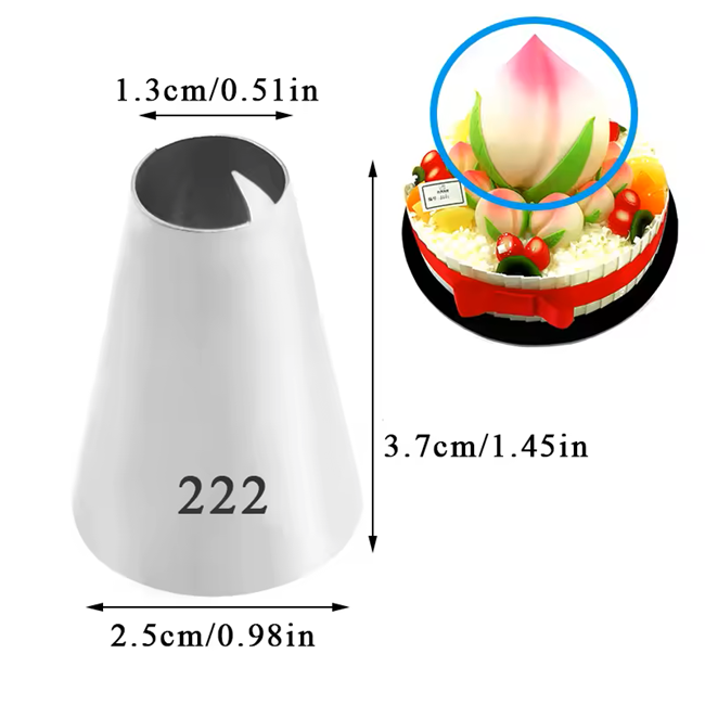 The 222 piping nozzle is designed to create leaf shapes, small petals, and bloom-style